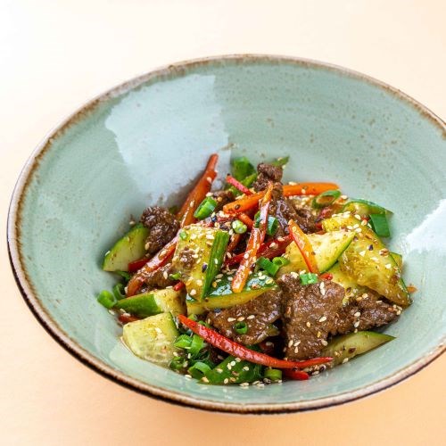 пряная говядина, огурцы, болгарский перец, чеснок, соус кимчи, кунжут, 389 ккал.
