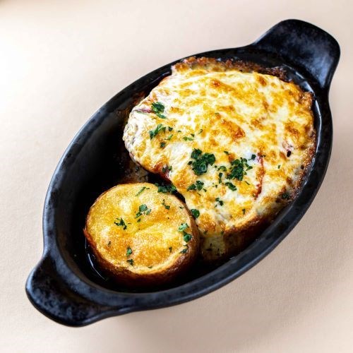 свинина запеченная с овощами, картофелем и шампиньонами под сырно-чесночным соусом. 478 ккал.