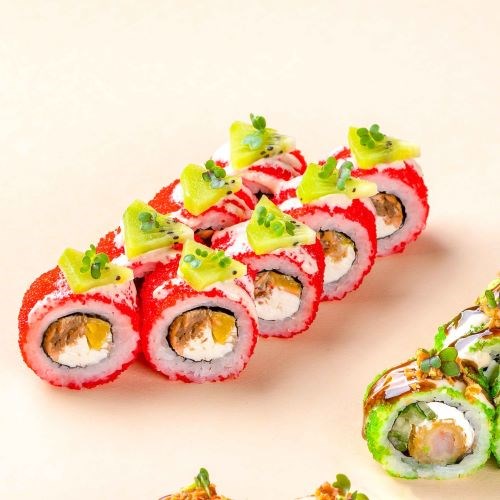 жареный лосось, сыр филадельфия, манго, икра тобико красная, киви, фирменный соус, 400ккал