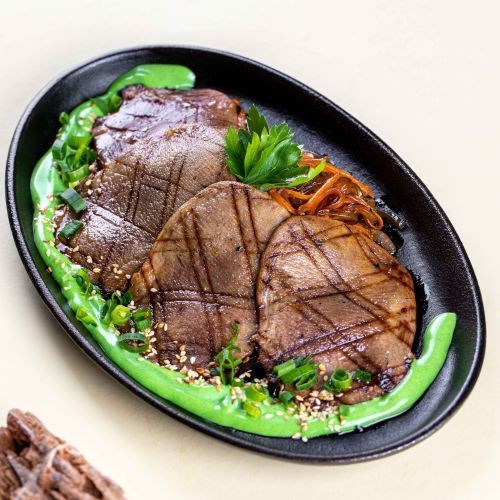 говяжий язык, обжаренный с лапшой харусамэ, овощами и шампиньонами, подается с соусом васаби, кунжутом и зеленым луком, 815 ккал.