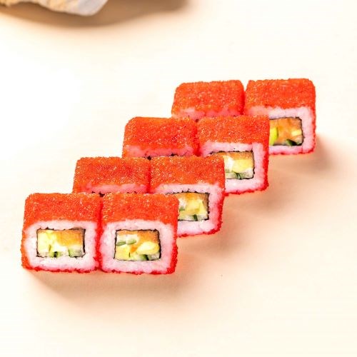 Половина порции (4шт. роллов), лосось, огурцы, икра тобико, авокадо, 198,5 ккал.