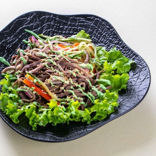 отварной говяжий язык, болгарский перец, свежие огурцы, красный лук, соус васаби, кунжут, японский дрессинг, 413 ккал.