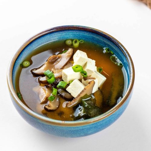 традиционный японский суп на основе бульона мисо с добавлением грибов шиитаке, тофу и водорослей вакамэ, 130 ккал.