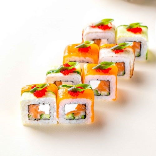 лосось копченый угорь, огурец, сыр филадельфия, зеленый лук, 443 ккал.