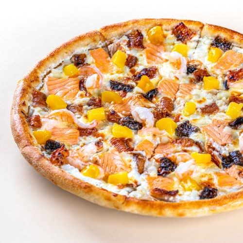 Сырно-чесночный соус, сыр филадельфия, хрустящий угорь, кальмары, лосось, креветки, сыр моцарелла, манго, 1424 ккал.