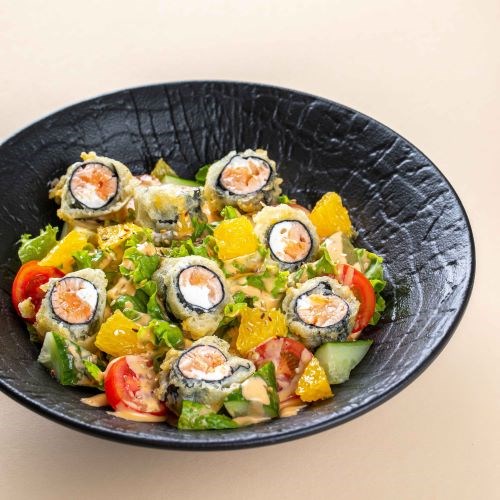 рулет из семги обжаренный в кляре, микс салата, филе апельсина, помидоры черри, свежие огурцы, соус том-ям, соус дрессинг, кунжут, 341 ккал.