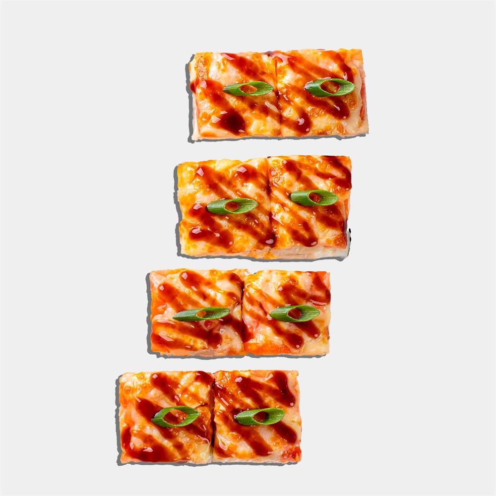 сырно-чесночный соус, сыр моцарелла, унаги соус, угорь, помидор. 617 ккал.
