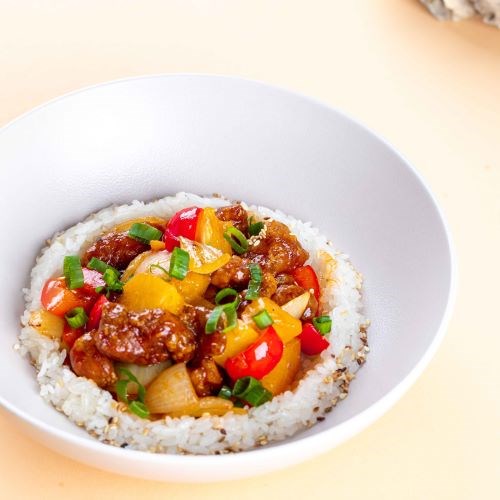 свинина, обжаренная в кисло-сладком соусе, с ананасами, болгарским перцем, чесноком, перцем чили, подается на подушке из отварного риса, 473 ккал.