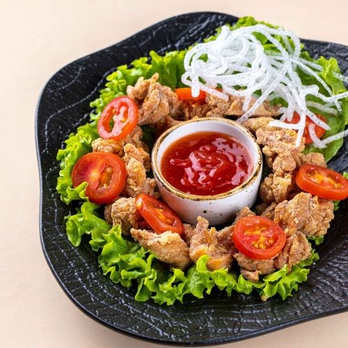 ломтики курицы в хрустящей панировке, салат айсберг, кунжут, подается с соусом сладкий чили и кимчи,водоросли вакамэ и помидор черри, 410 ккал.