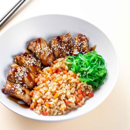 курица в соусе терияки с рисом и овощами, подается с салатом чукка. 542 ккал.