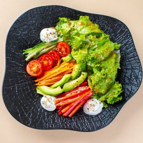 микс салата, авокадо, болгарский перец, огурцы, помидоры черри, морковь, японский дрессинг, сыр филадельфия, кунжут, 206 ккал.